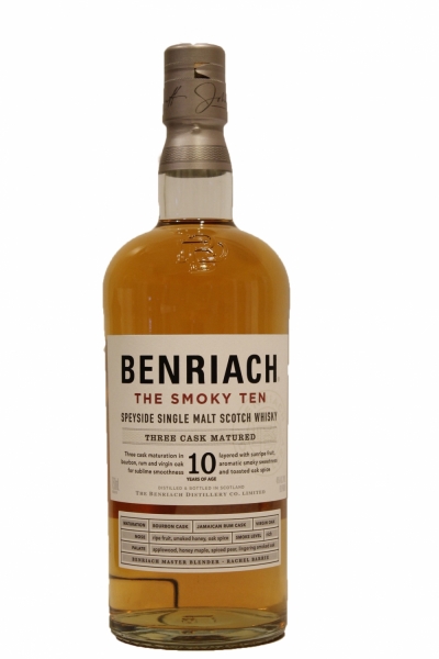 Benriach broke convention in Speyside by returning to distilling batches of whisky in the old, 19th century style, using malted barley smoked with Highland peat. This wood rich Highland peat imparts distinctly sweet and smoky notes into Benriach peated whiskies. Benriach The Smoky Ten has been crafted from a combination of unpeated and peated spirit and three cask matured for at least ten years in a combination of bourbon barrels, Jamaican rum casks and toasted virgin oak. The whisky is then expertly married together to create sublimely smooth layers of sunripe fruit, aromatic smoke and toasted oak spice, lingering into the perfectly balanced sweet and smoky finish.